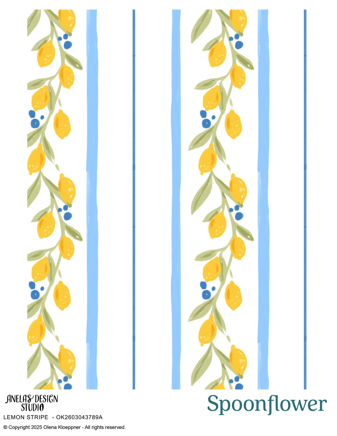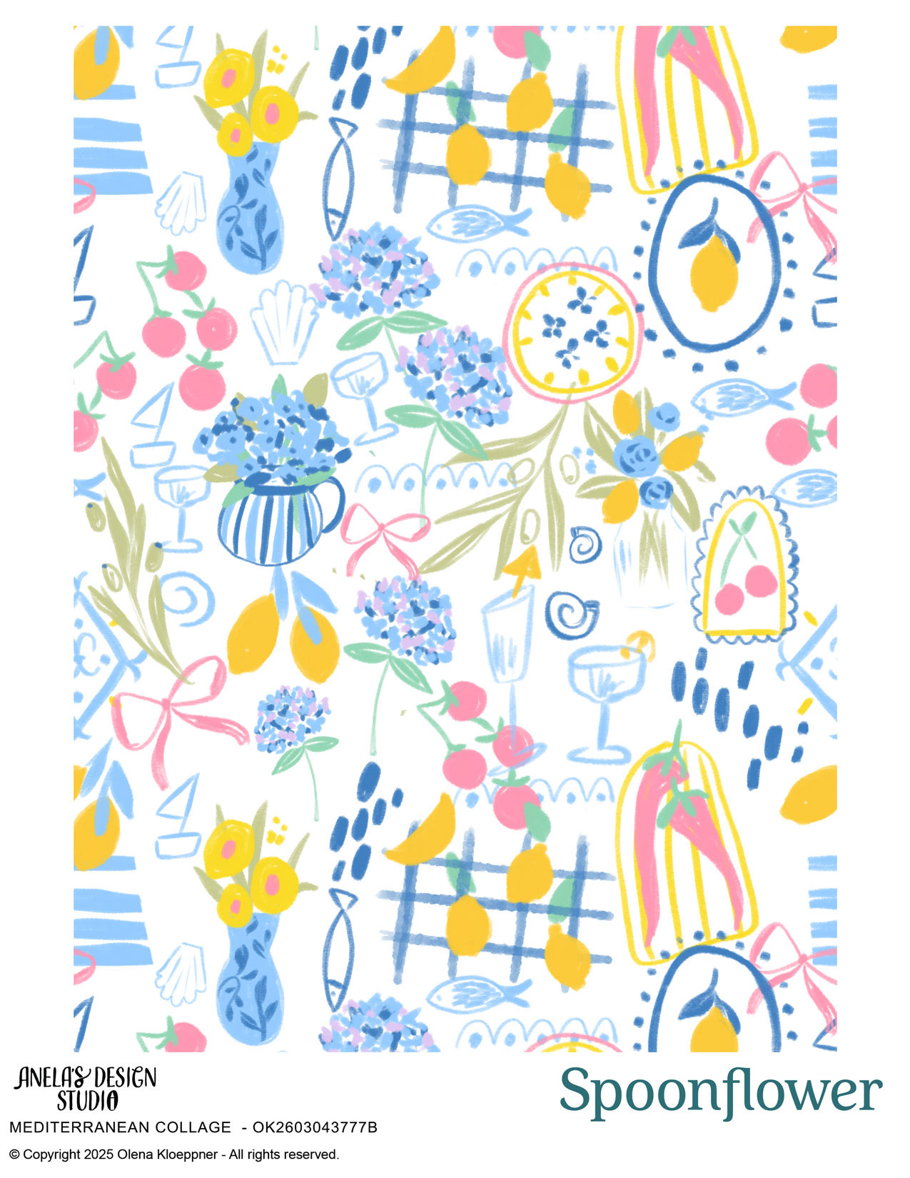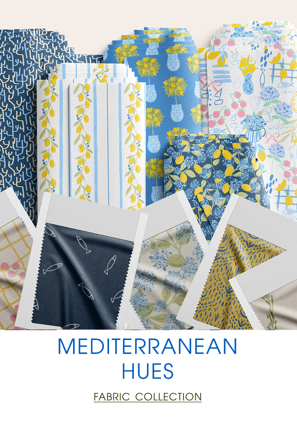 Mediterranean Hues is a fresh surface pattern collection inspired by sunlit coastal living. Citrus branches, florals, ceramics, and simple coastal motifs are paired with painterly textures, stripes, and playful coordinates.