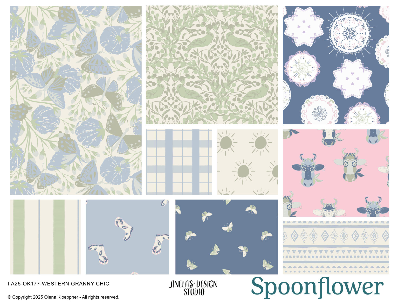 A gentle, nature-inspired fabric collection in calming blue and green tones, featuring delicate florals, lace-like medallions, subtle geometrics, and charming countryside motifs. Designed to mix effortlessly, these prints bring a peaceful, nostalgic feel to quilts, home décor, nursery spaces, and timeless handmade pieces.